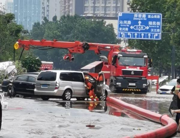 江蘇消防救援隊(duì)在中原區(qū)航海路桐柏路交叉口用遠(yuǎn)程供水系統(tǒng)抽水。 截至7月21日19時,救援隊(duì)伍先后在20個內(nèi)澇嚴(yán)重地點(diǎn)開展排澇作業(yè),在阜外華中心血管醫(yī)院開展病人轉(zhuǎn)運(yùn)作業(yè),共出動指戰(zhàn)員360人次,車輛85輛次,排水4.32萬噸,疏散群眾28人,轉(zhuǎn)移物資36.7噸。